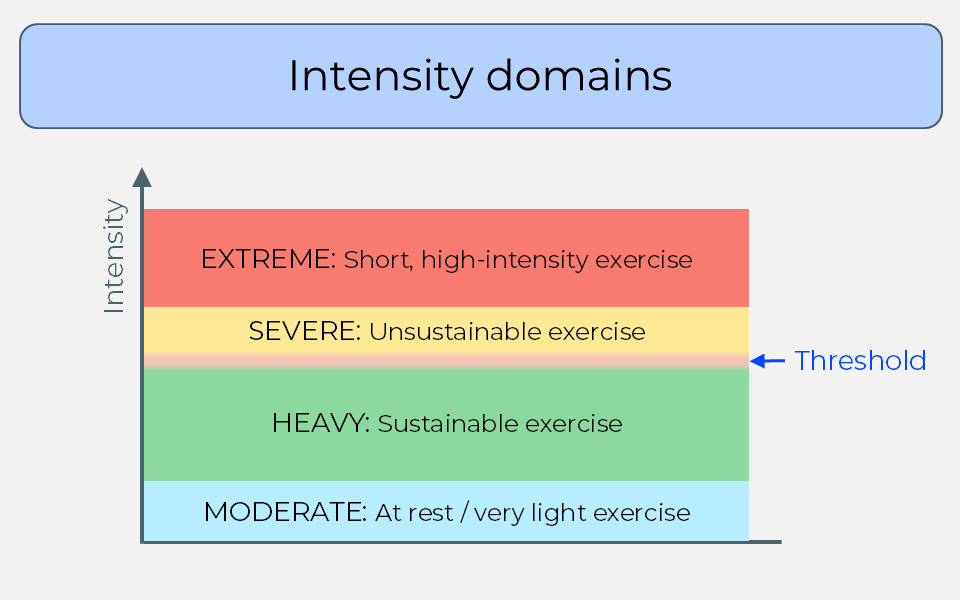 Many runners are familiar with VO2max which, according to Wikipedia, is ‘the maximum rate of oxygen consumption attainable during physical exertion’. VO2max is above the heavy domain, but it too does not have a single point at which it occurs, and you cannot reach VO2max from all higher intensities – some intensities are too high and lead to fatigue failure before you attain VO2max. There is broad acceptance among researchers that intensities below VO2max are severe, while intensities above VO2max are extreme, but this distinction isn’t universally used.
